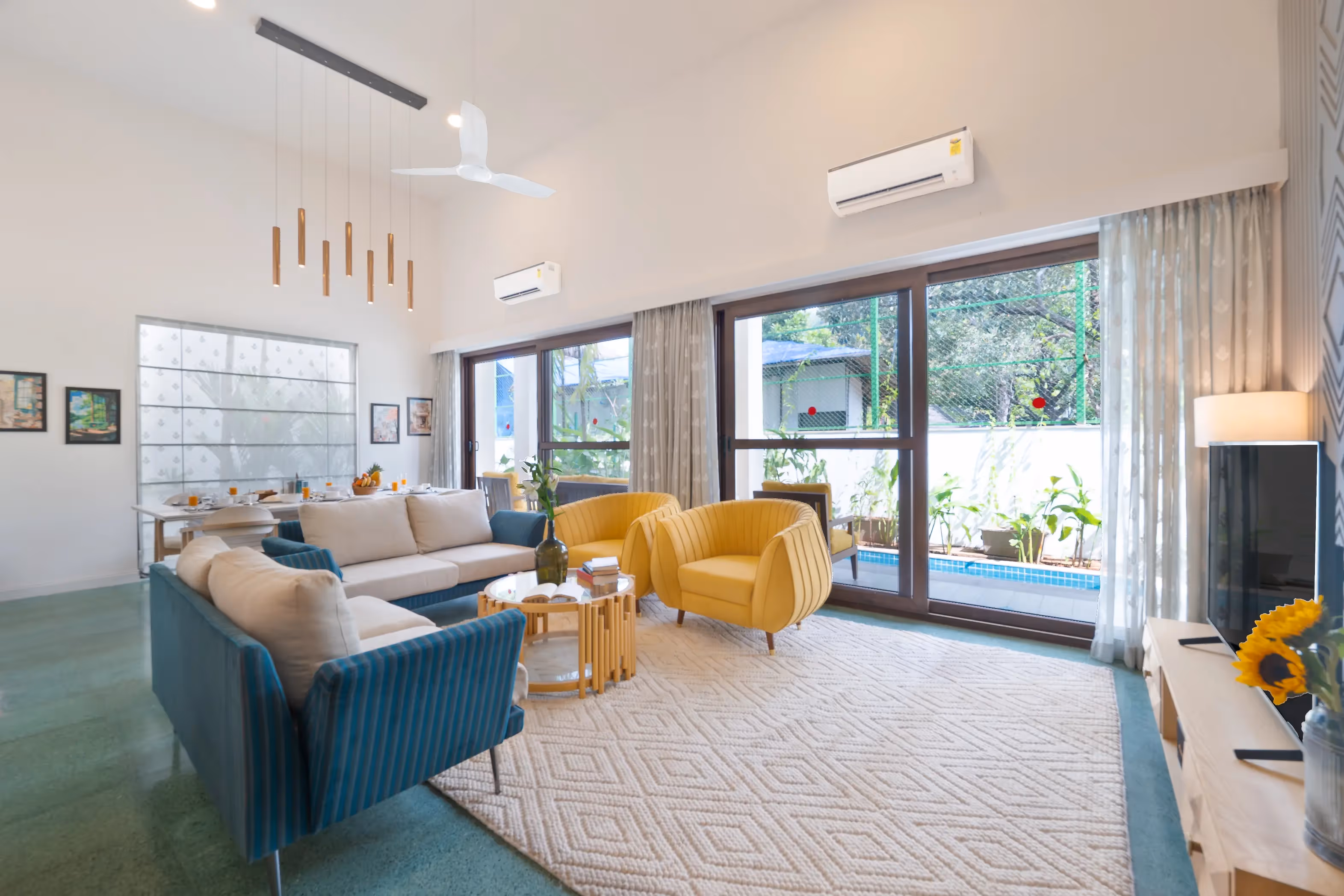 The open-plan layout flows into an elegant dining area that opens onto a private pool deck—perfect for al fresco dining, intimate gatherings, or entertaining under the Goan sky.