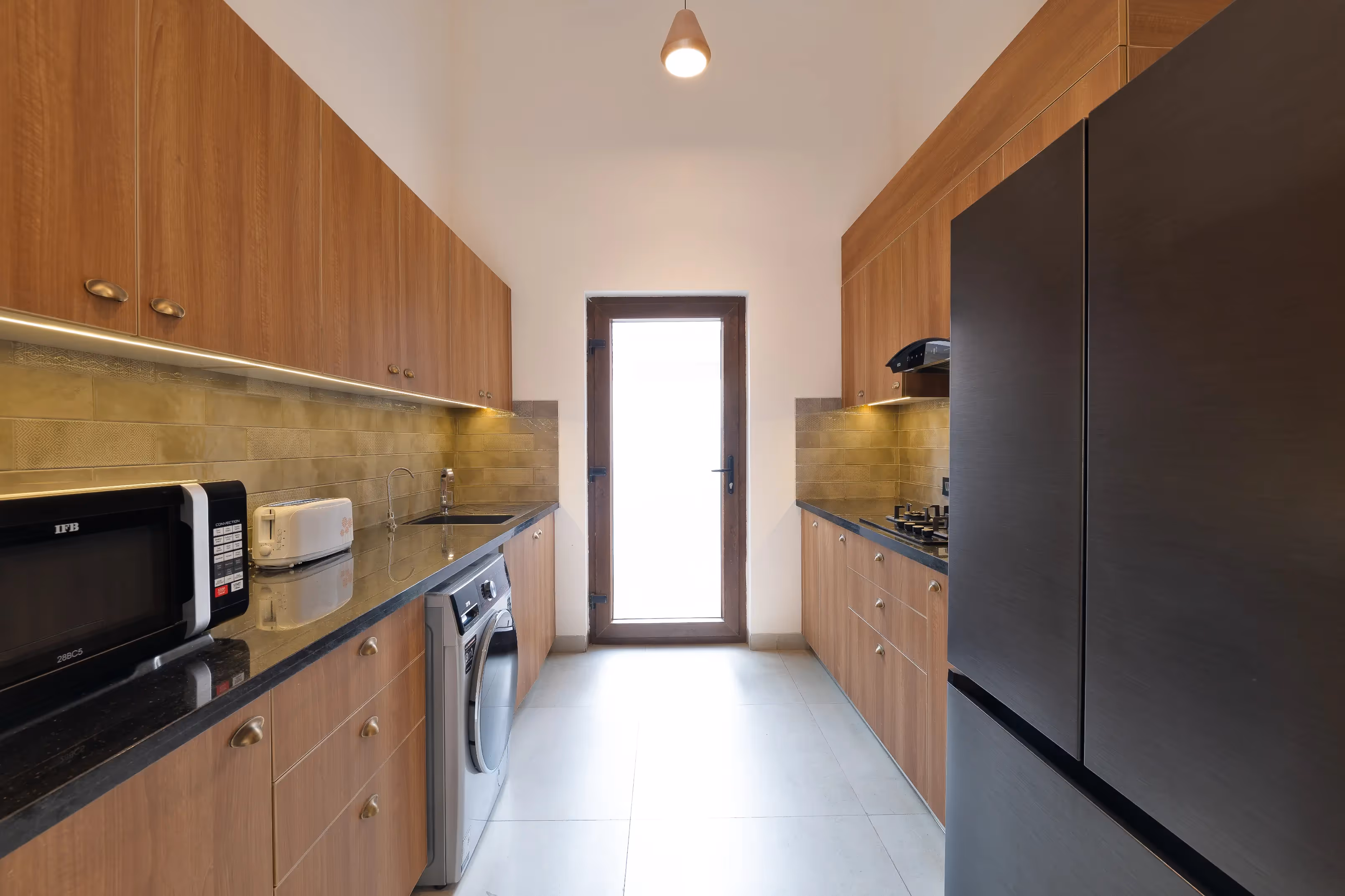 The modern modular kitchen is fully equipped with premium appliances and ample storage. Whether you’re preparing a simple breakfast or hosting a gourmet meal with a private chef, this functional space caters effortlessly to all your culinary needs.
